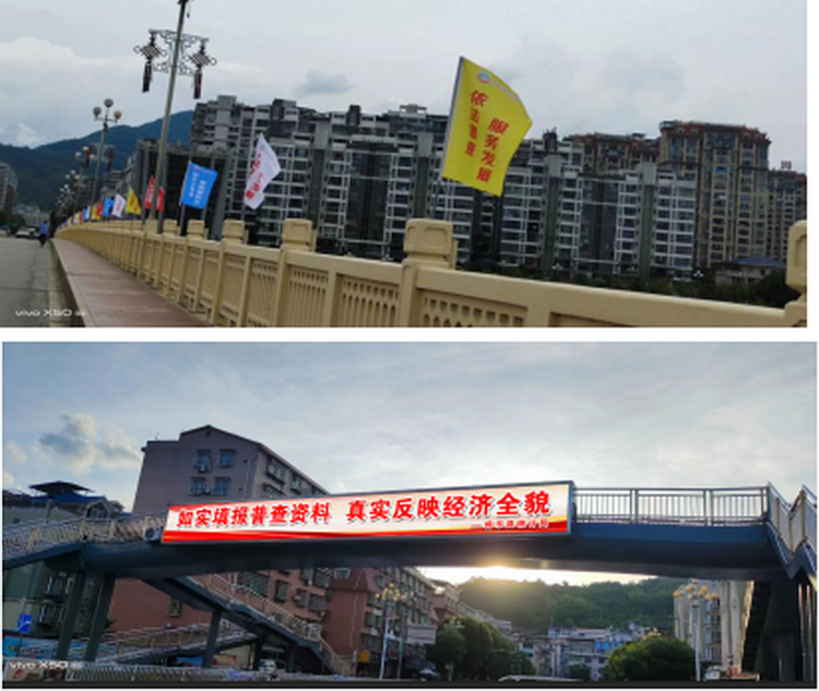 在动车站出入口、十字街等人流密集地设立大型户外五经普宣传广告;在城区主桥三华桥、二桥设立200面五经普宣传彩旗;制作分发给各乡(镇)、村(社区)及县有关单位经普宣传横幅89条,通过悬挂横幅、粘贴宣传画、标语、LED滚动播放经普宣传标语,大面积全覆盖,传播经济普查声音。