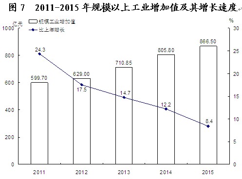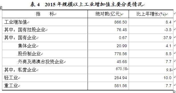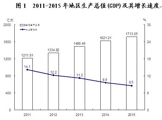 国民经济平稳增长。初步核算,全年实现地区生产总值1713.05亿元,比上年增长8.5 %。其中,第一产业增加值252.08亿元,增长3.7%;第二产业增加值875.16亿元,增长8.7%;第三产业增加值585.80亿元,增长10.2%。人均地区生产总值67978元,比上年增长8.1%。第一产业增加值占地区生产总值的比重为14.7%,第二产业增加值比重为51.1%,第三产业增加值比重为34.2%。 “十二五”期间,全市地区生产总值年均增长11.1%,其中第一、第二、第三产业年均分别增长4.4%、14.4%和8.8%。三次产业结构由2010年的17.3∶49.2∶33.5调整为2015年的14.7∶51.1∶34.2。