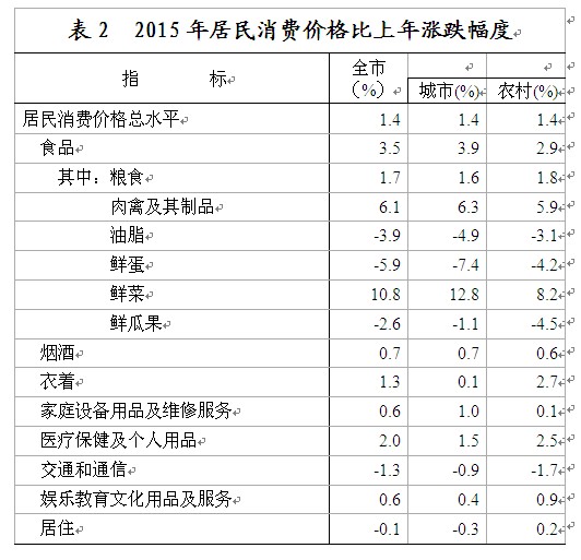 价格水平涨幅较低。全年居民消费价格比上年上涨1.4 %,其中食品价格上涨3.5%。工业生产者出厂价格下降6.1%。