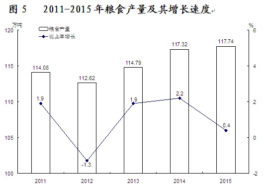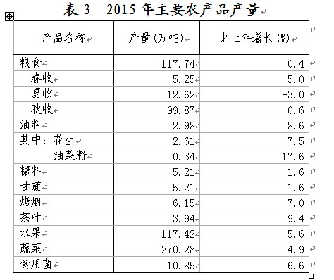 二、农业 农业生产增势较好。全年农林牧渔业完成总产值414.90亿元,比上年增长3.9%。粮食种植面积331.74万亩,比上年增加6.51万亩,其中稻谷面积218.19万亩,增加0.07万亩;烟叶种植面积46.52万亩,减少1.21万亩;油料种植面积19.72万亩,增加0.97万亩;蔬菜种植面积163.81万亩,增加4.46万亩。 全年粮食产量117.74万吨,比上年增加0.43万吨,增长0.4%。其中,稻谷产量89.99万吨,减产1.31万吨,下降1.4%。