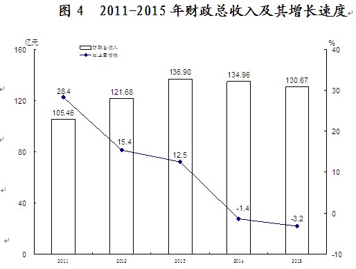 财政总收入呈负增长态势。全年公共财政总收入130.67亿元,比上年下降3.2 %,其中,地方公共财政收入93.68亿元,增长3.0%;公共财政支出242.81亿元,增长22.1 %。全市国税总收入(含海关代征)49.23亿元,下降21.1%;全市地税系统组织各项收入93.25亿元,下降7.5%。 “十二五”期间,财政总收入累计达到629.67亿元,地方级财政收入累计达到416.42 亿元,财政支出累计达到903.13亿元,分别是“十一五”时期的2.0倍、2.4倍和3.0倍,年均增速分别达到9.7%、13.5%和20.1%。