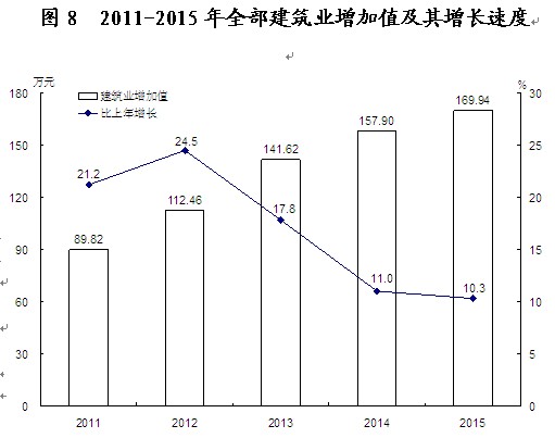 全年规模以上工业企业实现利润61.44亿元,比上年下降18%;其中国有及国有控股企业利润下降2倍,由盈转亏,盈亏相抵后亏损7.09亿元;国有企业利润0.09亿元,下降19.1%,集体企业0.39亿元,下降39.4%,股份制企业55.47亿元,下降19.1%,外商及港澳台商投资企业3.55亿元,下降1%;私营企业60.19亿元,增长0.2%。 全年全社会建筑业实现增加值169.94亿元,比上年增长10.3%。全市具有资质等级的总承包和专业承包建筑业企业完成建筑业总产值 557.89亿元,增长16.0%;房屋施工面积4694.56万平方米,增长13.8%;房屋建筑竣工面积1605.97万平方米,下降13.3 %。