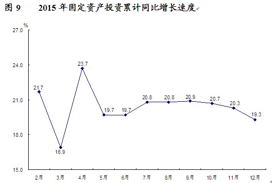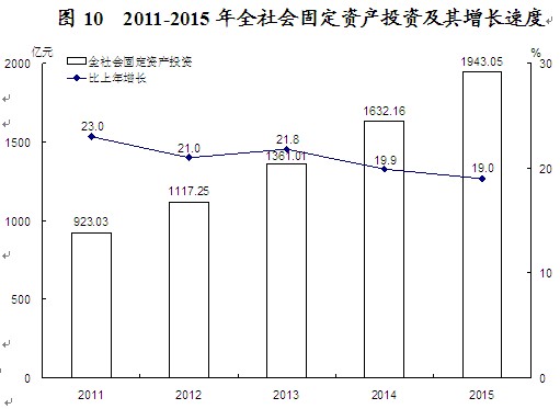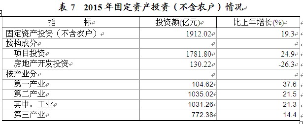 “十二五”期间,全市工业增加值年均增长15.3%,建筑业增加值年均增长16.8%。 四、固定资产投资 固定资产投资较快增长。全年全社会固定资产投资1943.05亿元,比上年增长19.0%。其中,固定资产投资(不含农户)1912.02亿元,增长19.3%;农户投资31.03亿元,增长6.7%。