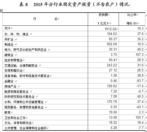 在固定资产投资(不含农户)中,第一产业投资增长37.6%;第二产业投资增长21.5%,其中,工业投资增长21.3%;第三产业投资增长14.4%。从到位资金情况看,全年到位资金1841.37亿元,比上年增长18%。其中,国家预算资金增长44.2%,国内贷款增长 20.9%,利用外资下降95.6%,自筹资金增长20.5%,其他资金下降 9.9%。