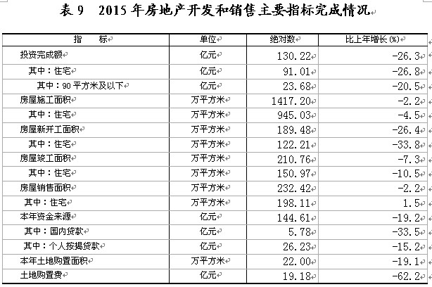 全年房地产开发投资130.22亿元,比上年下降26.3 %。其中,住宅投资91.01亿元,下降26.8%;办公楼投资4.99亿元,增长15.7%;商业营业用房投资19.21亿元,下降31.0%。