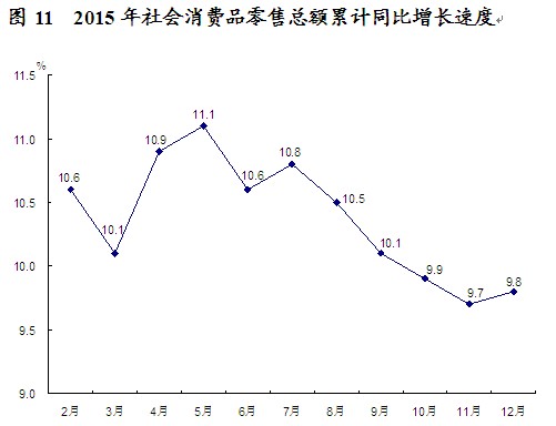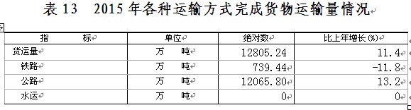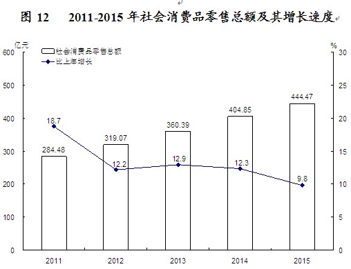 “十二五”期间,全社会固定资产累计投资6976.5亿元,相当于“十一五”时期的2.6倍,五年间投资年均增长21%。 五、国内贸易 市场销售平稳增长。全年社会消费品零售总额444.47亿元,比上年增长9.8%。按经营地统计,城镇消费品零售额389.83亿元,增长9.6%;乡村消费品零售额54.64亿元,增长11.2%。 电子商务交易活跃。全年限额以上企业实现网上零售额25.24亿元,比上年增长43.7%。“正统网”入驻电子商务企业272家,比上年增加194家。