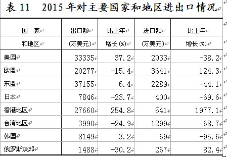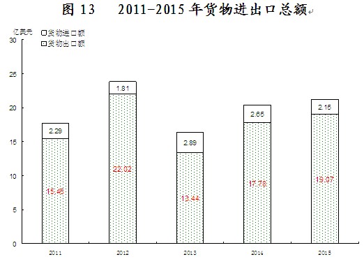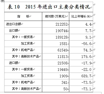 在限额以上企业商品零售额中,通讯器材类零售额比上年增长69.2%,服装鞋帽针纺织品类增长28.1%,化妆品类增长26.5%,家具类增长17.9%,家用电器和音响器材类增长17.1%,金银珠宝类增长16.4%,粮油食品类增长11.4%、其中粮油类增长7.8%,日用品类增长11.3%,汽车类增长2%,石油及制品类下降7.1%。 “十二五”期间,全市累计实现社会消费品零售总额1813.26亿元,相当于“十一五”时期的1.06倍,五年间社会消费品零售总额年均增长13.2%。 六、对外经济 进出口平稳增长。全年进出口总额 131.06亿元人民币,以美元计价为21.23亿美元,比上年增长4.4%。其中,出口117.70亿元人民币,以美元计价为19.07亿美元,增长7.7%;进口13.36 亿元人民币,以美元计价为2.15亿美元,下降17.9%。进出口顺差104.34亿元人民币,以美元计价为16.92亿美元,比上年增加1.76亿美元。 批准设立外商直接投资项目27个,比上年下降32.5%。实际利用外商直接投资1.56亿美元,增长11.4%。