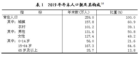 年末全市常住人口259万人,比上年末增加1万人。其中,城镇常住人口157.8万人,占总人口比重(常住人口城镇化率)为 60.9%,比上年末提高0.7个百分点。全年常住出生人口3.5万人,出生率为13.6‰;死亡人口1.7万人,死亡率为6.6‰;自然增长率为7.0‰。