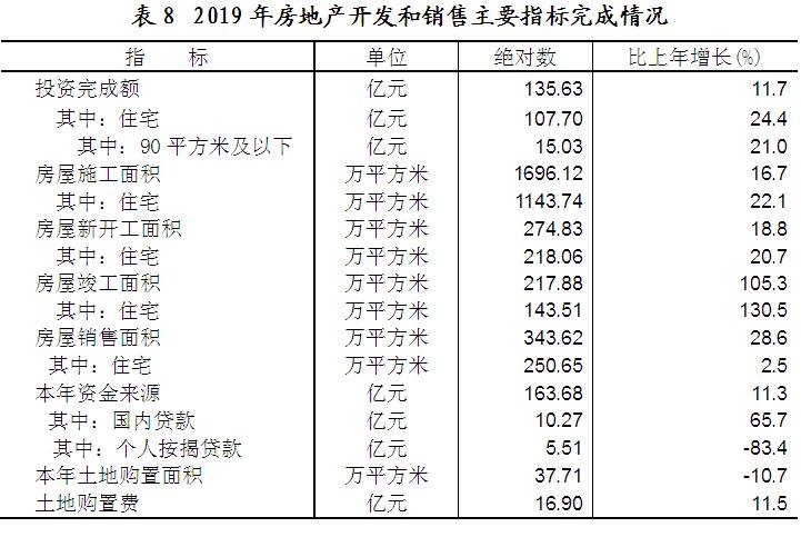 全年房地产开发投资135.63亿元,比上年增长11.7%。其中,住宅投资107.70亿元,增长24.4%;办公楼投资1.03亿元,下降68.6%;商业营业用房投资8.96亿元,下降20.8%。