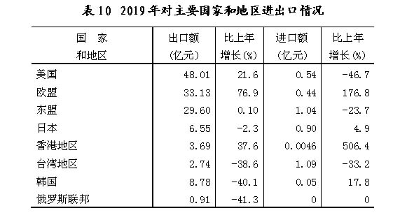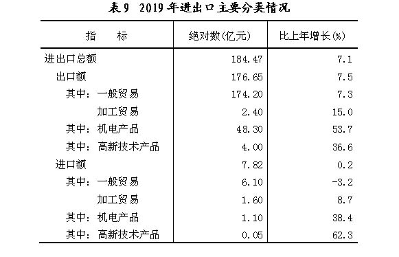 2019年,全年进出口总额184.47亿元,比上年增长7.1%。其中,出口176.65亿元,增长7.5%;进口7.82亿元,增长0.2%。进出口顺差168.83亿元,比上年增加12.13亿元。对“一带一路”沿线国家和地区出口51.57亿元,下降7.4%。