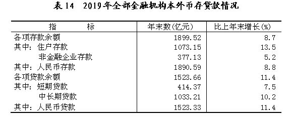 年末全市金融机构本外币各项存款余额1899.52亿元,比上年末增长8.7%;金融机构本外币各项贷款余额1523.66亿元,增长11.4%。