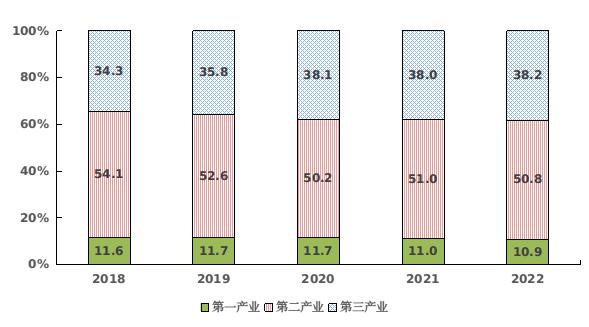 图2 2018-2022年三次产业增加值占地区生产总值比重