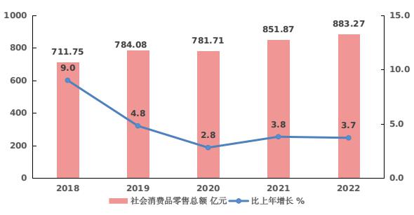 图6 2018-2022年社会消费品零售总额及其增长速度