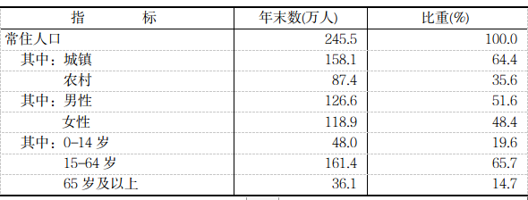 年末全市常住人口245.5万人。其中,城镇常住人口158.1万人,占总人口比重(常住人口城镇化率)为64.4%,比上年末提高0.7个百分点。年末全市户籍总户数80.35万户,户籍人口285.61万人,比上年末减少1.09万人。