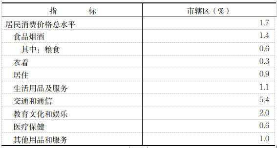 市辖区全年居民消费价格比上年上涨1.7%,其中食品烟酒价格上涨1.4%。商品零售价格上涨2.2%。