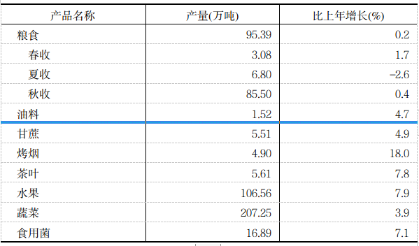 全年粮食产量95.39万吨,比上年增加0.18万吨。其中,稻谷产量77.60万吨,减少0.26万吨。