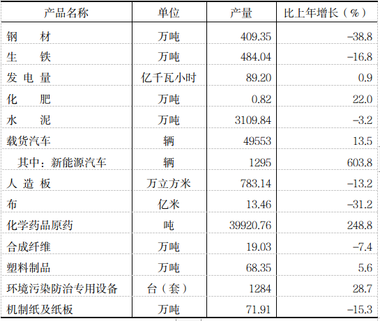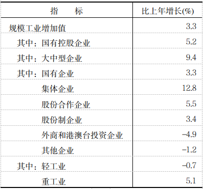 全年全部工业增加值1148.85亿元,比上年增长2.4%。规模工业增加值增长3.3%。在规模工业中,分经济类型看,国有控股企业增长5.2%;国有企业增长3.3%,集体企业增长12.8%,股份合作企业增长5.5%,股份制企业增长3.4%,外商及港澳台商投资企业下降4.9%;其他企业下降1.2%。分轻重看,轻工业同比下降0.7%,重工业增长5.1%。分门类看,采矿业下降6.0%,制造业增长4.7%,电力、热力、燃气及水生产和供应业下降5.2%。工业产品销售率97.76%,比上年下降0.62个百分点。