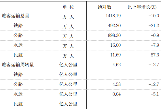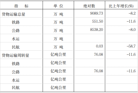 全年货物运输总量9089.73万吨,比上年下降8.2%;旅客运输总量1418.19万人,比上年下降10.0%。