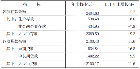 年末全市金融机构本外币各项存款余额2404.60亿元,比上年末增长9.2%;金融机构本外币各项贷款余额2100.40亿元,增长11.6%。农村合作金融机构人民币各项贷款余额413.96亿元,比上年末增长13.2%。金融机构人民币个人消费贷款余额764.73亿元,比上年末增长3.9%,住房贷款余额566.05亿元,同比增长3.9%。