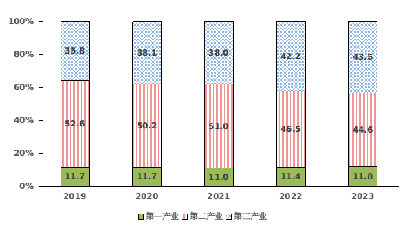 图2 2019-2023年三次产业增加值占地区生产总值比重