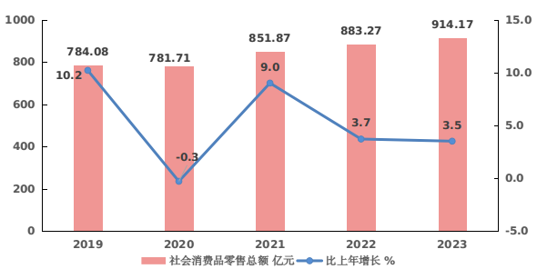 全年社会消费品零售总额914.17亿元,比上年增长3.5%。其中,限上企业零售额136.35亿元,下降4.7%;限下企业和个体户零售额777.82亿元,增长5.1%。限额以上企业实现网上零售额5.16亿元,比上年下降37.8%。