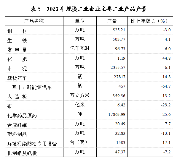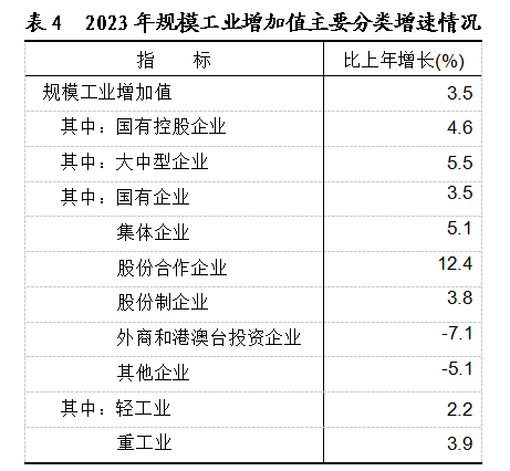全年全部工业增加值比上年增长2.7%。规模以上工业增加值增长3.5%。在规模工业中,分经济类型看,国有控股企业增长4.6%;国有企业增长3.5%,集体企业增长5.1%,股份合作企业增长12.4%,股份制企业增长3.8%,外商及港澳台商投资企业下降7.1%;其他企业下降5.1%。分轻重工看,轻工业增长2.2%,重工业增长3.9%。分门类看,采矿业增长7.1%,制造业增长3.1%,电力、热力、燃气及水生产和供应业增长1.7%。工业产品销售率为97.72%,比上年提高0.37个百分点。