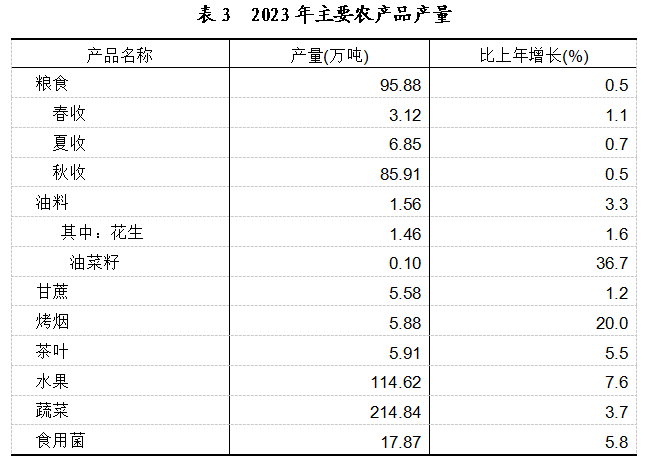 全年粮食产量95.88万吨,比上年增加0.50万吨。其中,稻谷产量77.88万吨,增加0.28万吨。