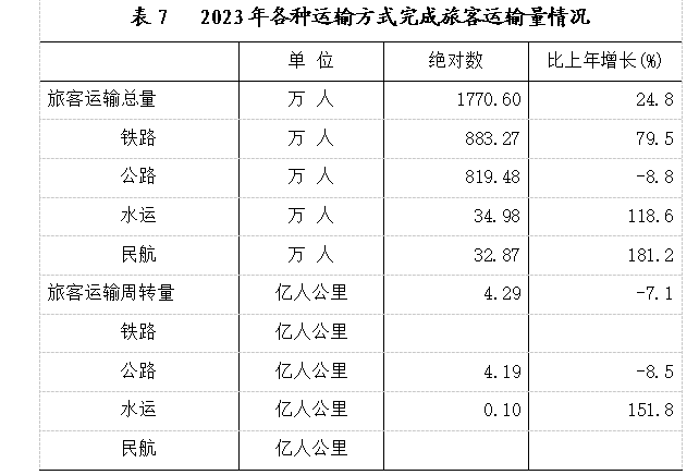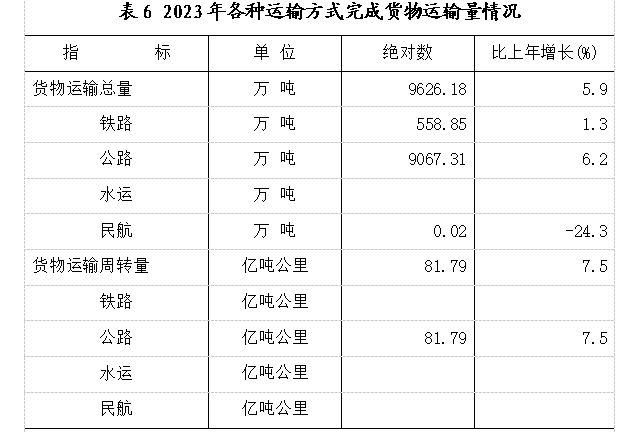 全年货物运输总量9626.18万吨,比上年增长5.9%;旅客运输总量1770.60万人,比上年增长24.8%。