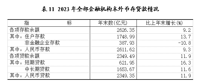 年末全市金融机构本外币各项存款余额2626.35亿元,比上年末增长9.2%;金融机构本外币各项贷款余额2349.49亿元,比上年末增长11.9%。年末农村合作金融机构人民币各项贷款余额476.42亿元,比上年末增长15.1%。金融机构人民币个人消费贷款余额772.70亿元,比上年末增长1.1%,住房贷款余额553.28亿元,比上年末下降2.3%。