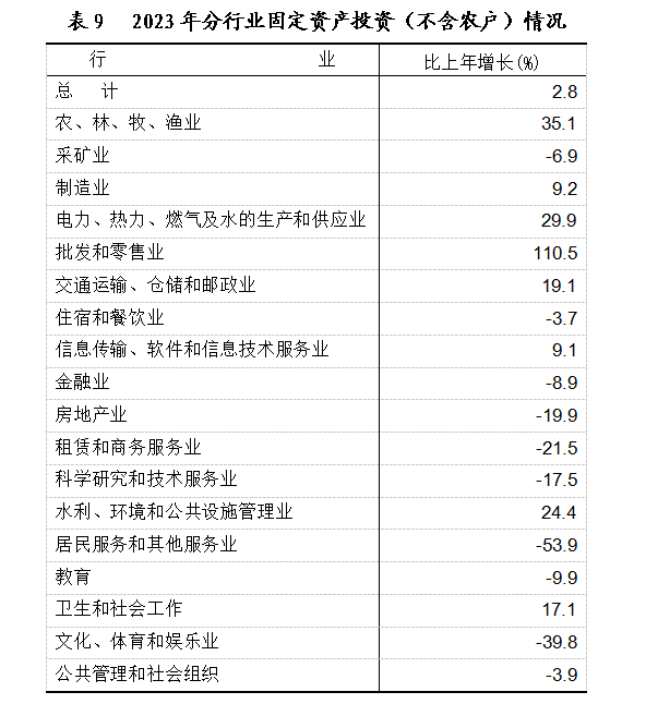 全年固定资产投资比上年增长2.8%。第一产业投资增长44.1%;第二产业投资增长10.4%;第三产业投资下降4.9%。其中,工业投资增长10.4%,占固定资产投资的比重为48.6%。基础设施投资增长15.1%,占固定资产投资的比重为22.0%。民间投资增长6.4%,占固定资产投资的比重为59.1%。高技术产业投资增长29.6%。全年到位资金比上年增长5.9%。