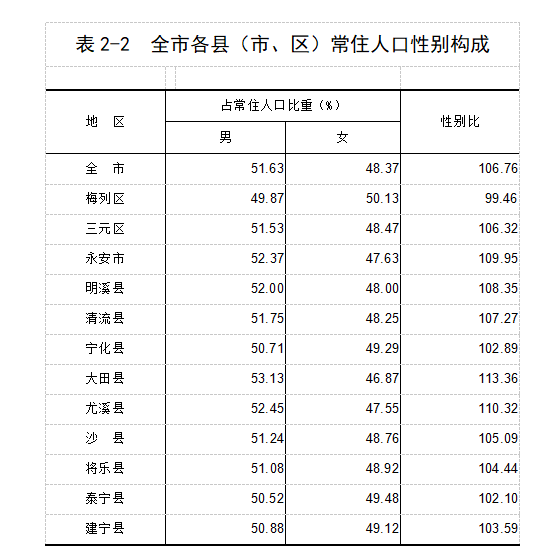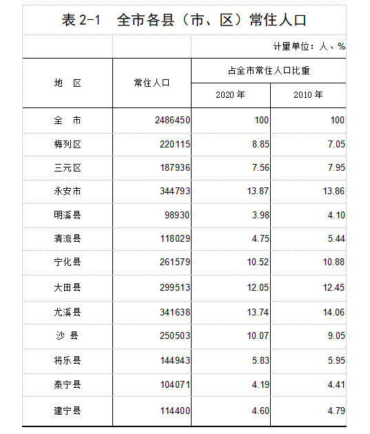 12个县(市、区)中,人口超过30万人的县(市、区)有2个,在20万人至30万人之间的县(市、区)有4个,在10万人至20万人之间的县(市、区)有5个,少于10万人的县(市、区)有1个。其中,人口居前三位的永安市、尤溪县和大田县合计人口985944人,占全市人口比重为39.7%。