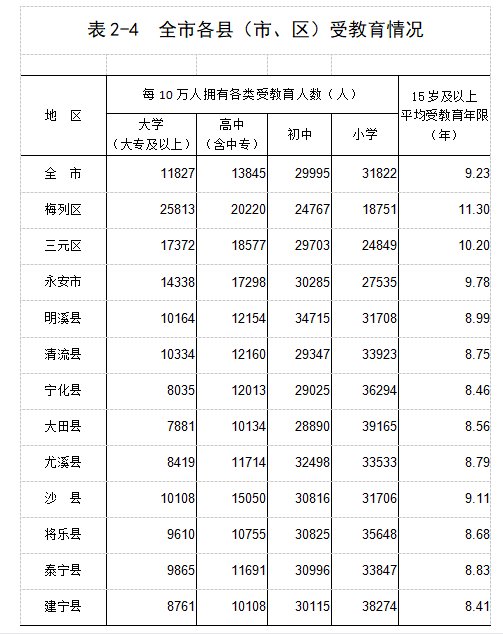 12个县(市、区)中, 6个县(市、区)每10万人中拥有大学(大专及以上)文化程度的人口超过10000人,其中,梅列、三元2个区每10万人中拥有大学(大专及以上)文化程度的人口超过15000人。